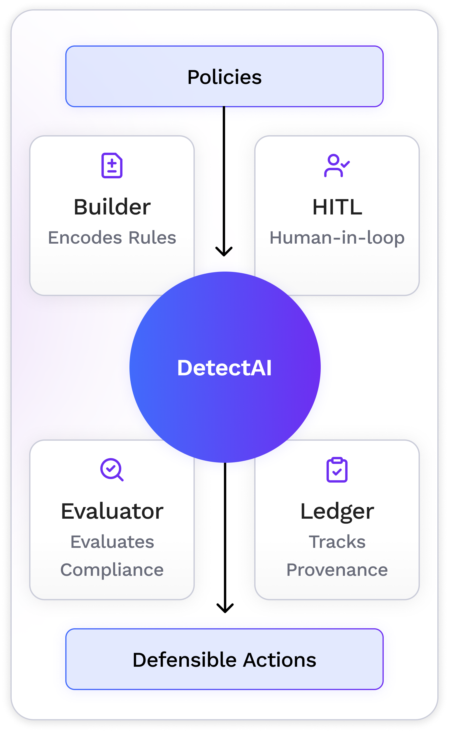 We’re policy-to-enforcement veterans. Our platform encodes your licensing terms, usage rights, and partner policies as machine-enforceable rules, then backs every decision with defensible artifacts and human-in-the-loop confirmation when needed. Our platform modules (HITL workbench, evaluator, policy & taxonomy builder, data provenance ledger) are safety-grade.