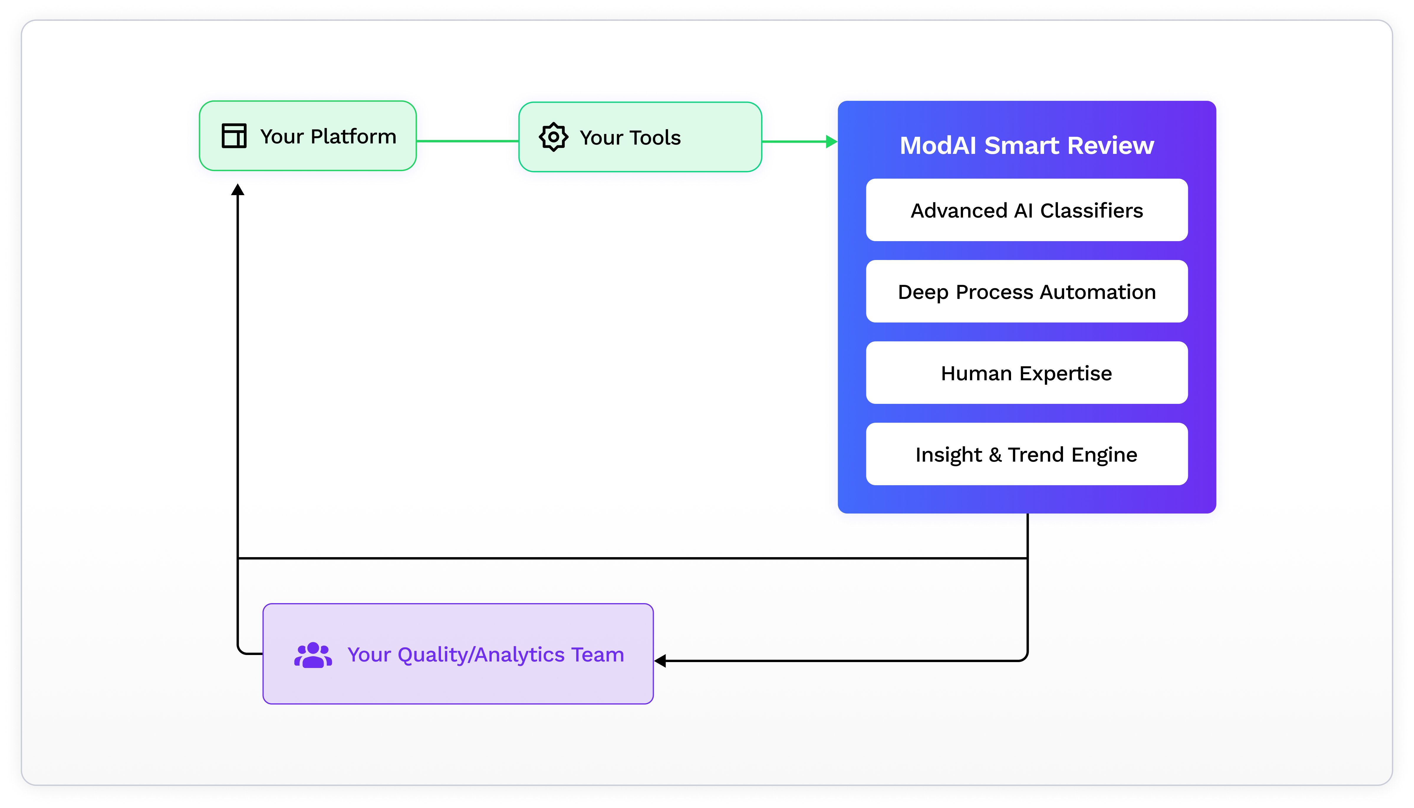 ModAI pre-screens and classifies each piece of content, while human experts review edge cases, confirm policy violations, and reinforce quality through contextual judgment.